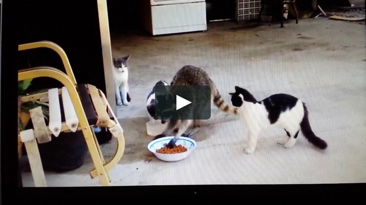 Dog and cat food must to be kept inside. Raccoon steals cat food. Spooky moment raccoon reaches its hands through the gaps in decking to steal kittens food.